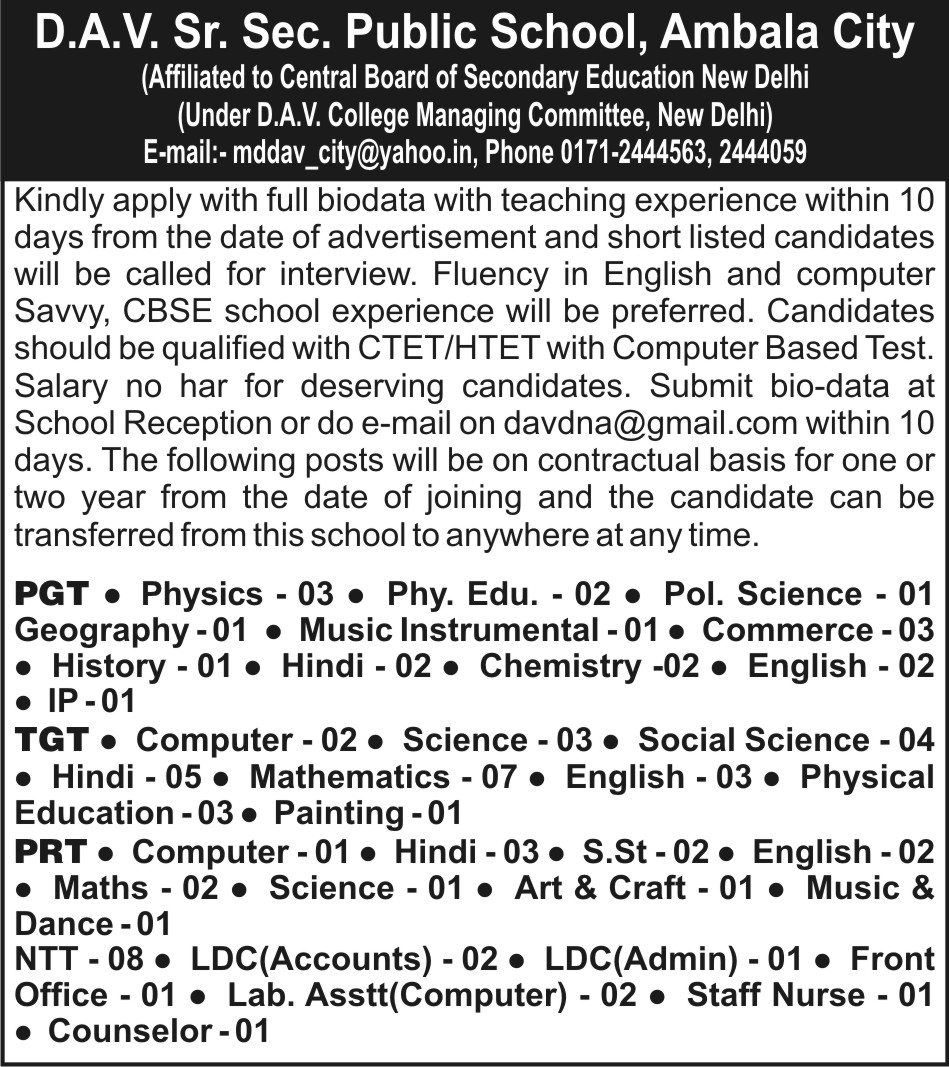 DAV SEN. SEC. PUBLIC SCHOOL Ambala City, Haryana - 134001. Ph. No. : 0171-2444563, Junior Wing : 0171-2442476 E-Mail : mddav_city@yahoo.co.in, davdna@gmail.com Website : www.davpsambala.in
