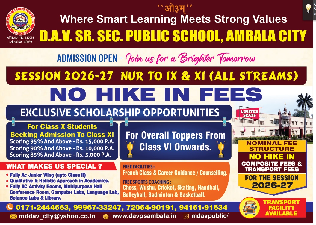 Welcome to D.A.V. Public School, Ambala City. Guided by Vedas and led by principles of Arya Samaj, M.D.A.V. Public School continues to uphold the